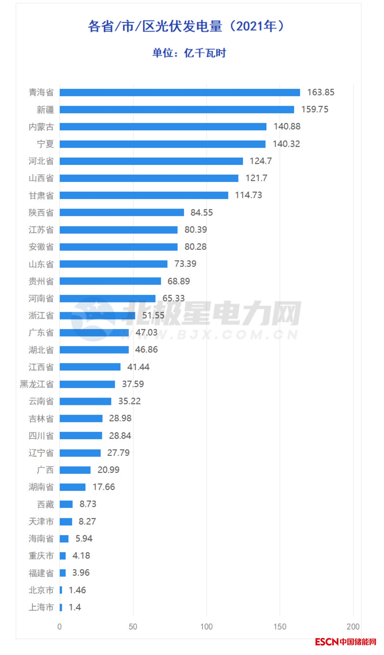2022年,光伏發(fā)電量排名TOP5的地方分別是:寧夏(184.77億千瓦時)、青海?。?84.28億千瓦時)、河北?。?76.44億千瓦時)、新疆(163.66億千瓦時)、內(nèi)蒙古(162.62億千瓦時)。