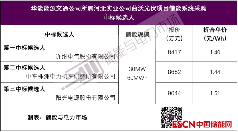 許繼電氣股份有限公司總報(bào)價(jià)8417萬元,折合單價(jià)1.4元/Wh,成為第一中標(biāo)候選人。