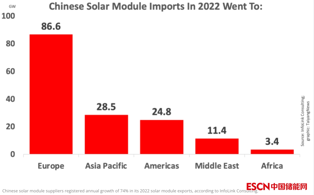 中國(guó)儲(chǔ)能網(wǎng)訊:據(jù)市場(chǎng)信息公司InfoLink Consulting的數(shù)據(jù),2022年中國(guó)向世界各國(guó)出口了154.8 吉瓦的太陽(yáng)能光伏組件,比2021年(88.8 吉瓦)增長(zhǎng)了74%;其中歐洲是最大的出口目的地,達(dá)到86.6吉瓦。