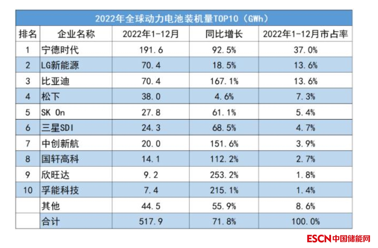根據韓國市場研究機構SNE Research數據,2022年全球動力電池裝機量為517.9GWh,同比增長71.8%。在裝機量前十名的企業(yè)中,中國動力電池企業(yè)占據6個席位,其中寧德時代連續(xù)6年奪得全球動力電池市場冠軍,比亞迪位列第三,而中創(chuàng)新航、國軒高科、欣旺達、孚能科技分列第七至第十。