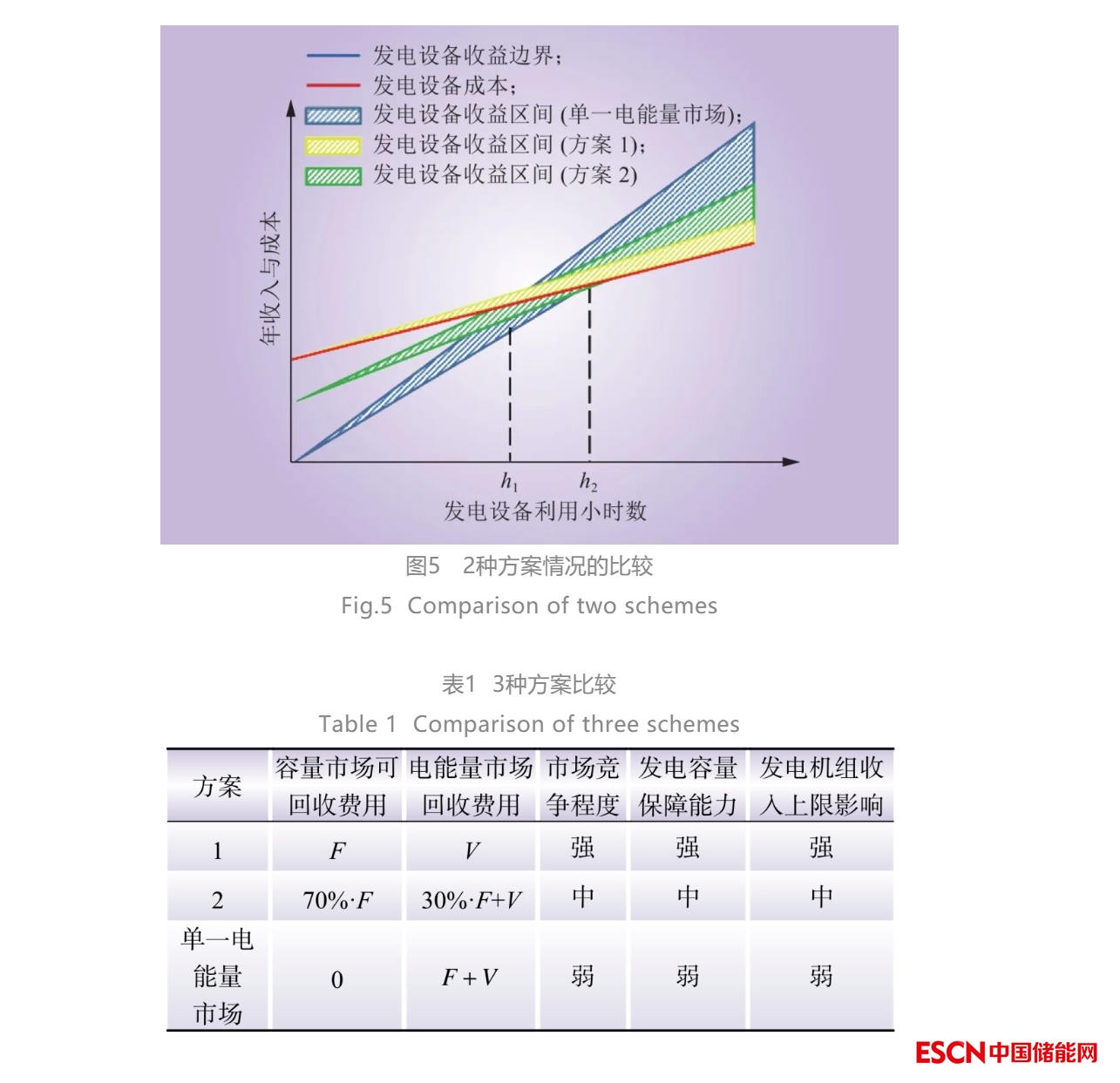 2種方案情況的收益情況比較如圖5所示。本文所提方案與單一電能量市場的情況比較如表1所示。表1中: F 為發(fā)電設(shè)備的固定成本; V 為發(fā)電企業(yè)的變動成本。結(jié)合圖5和表1可以看出:(1)方案2的發(fā)電設(shè)備有固定成本回收壓力。該方案下單位發(fā)電量的期望收益上升時,收益區(qū)間將增大。在發(fā)電設(shè)備利用小時數(shù)大于一定值時,方案2的發(fā)電設(shè)備收益高于方案1的發(fā)電設(shè)備收益,從而導致用戶用能價格稍高。(2)方案1可以減少固定成本回收壓力,從而促進發(fā)電商按照邊際成本報價,加劇市場競爭,有利于釋放電力市場建設(shè)進程中的改革紅利,降低用戶用能成本。方案2可以促進發(fā)電商發(fā)電積極性,以更高的發(fā)電量獲得更好收益。(3)方案1包含了發(fā)電設(shè)備的全部固定成本,可以有力保證所需發(fā)電容量的經(jīng)營情況,故其對全系統(tǒng)發(fā)電容量有強力的保障。發(fā)電設(shè)備需在電能量市場競爭從而回收30%的固定成本,方案2對發(fā)電容量保障能力相對弱于方案1。