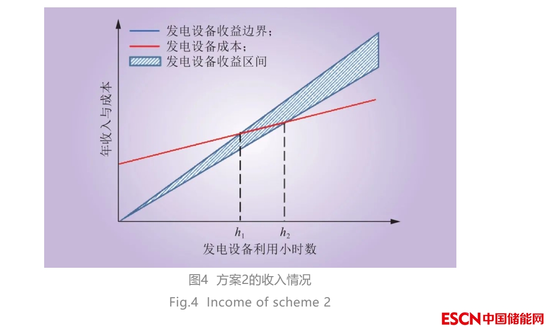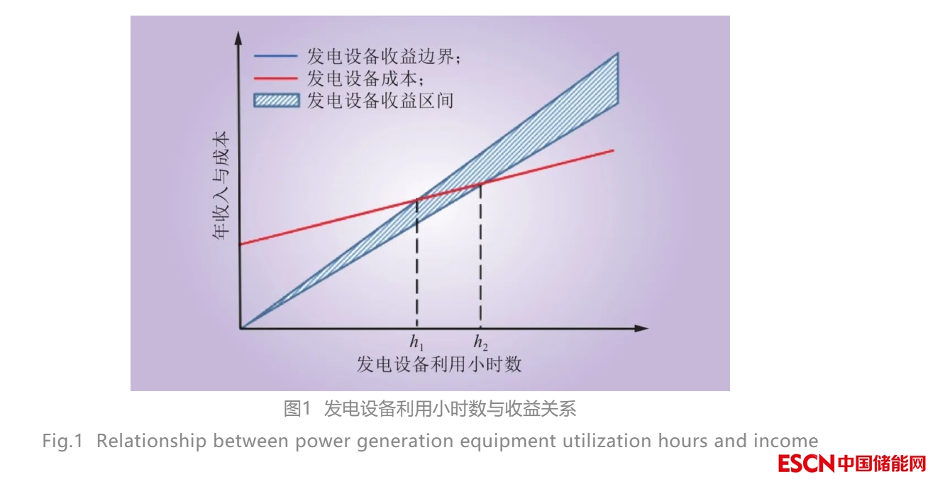 從圖1中可以看出,發(fā)電設(shè)備由于能效不同,單位利用小時數(shù)的收益也不同。發(fā)電設(shè)備的收益可以表示為一個區(qū)間。當發(fā)電利用小時數(shù)低于h1時,發(fā)電設(shè)備虧損。當利用小時數(shù)高于h2時,發(fā)電設(shè)備盈利。