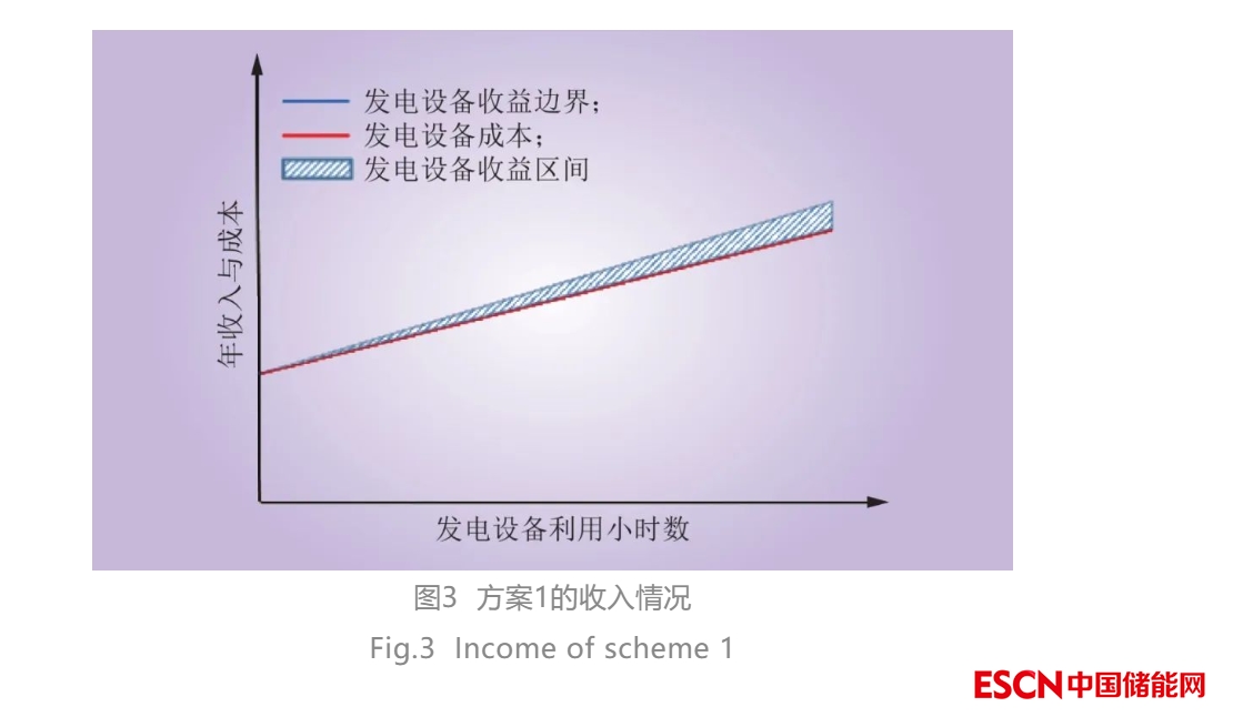 方案1為容量市場覆蓋發(fā)電設(shè)備固定成本的100%,電能量市場覆蓋發(fā)電設(shè)備變動成本及準許收益。發(fā)電設(shè)備利用小時數(shù)及收益情況如圖3所示。從圖3中可以看出,容量市場覆蓋全部固定成本的情況下,發(fā)電商會通過電能量市場競爭獲得發(fā)電設(shè)備上網(wǎng)發(fā)電量,從而獲取相應(yīng)利潤。發(fā)電設(shè)備固定成本已由容量市場覆蓋。發(fā)電商回收固定成本壓力小,只要上網(wǎng)發(fā)電就可以獲利。發(fā)電商可以在電能量市場報價中增加合理收益來獲得發(fā)電資格,從而不用顧慮固定成本帶來的成本回收問題。相較于單一電能量市場的價格收益,“容量市場+電能量市場”結(jié)合的市場機制可以促進發(fā)電商競爭,降低發(fā)電商的固定成本回收壓力,促進發(fā)電廠提高經(jīng)濟效率。