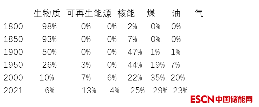 為了更好地理解這一點,以下是自1800年以來不同能源在全球能源結(jié)構(gòu)中的份額: