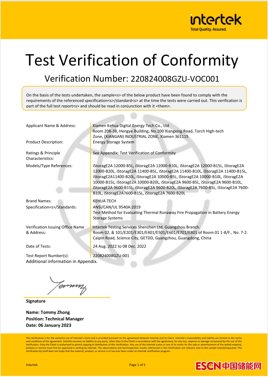 中國儲(chǔ)能網(wǎng)訊:近日,廈門科華數(shù)能科技有限公司(簡稱“科華數(shù)能”)iStoragE2A系列戶用儲(chǔ)能解決方案產(chǎn)品順利通過 UL9540、UL9540A、UL1973、UL1741、UL1998等系列安全測試,獲得Intertek天祥集團(tuán)(以下簡稱“Intertek”)授予認(rèn)證證書,為科華數(shù)能產(chǎn)品順利進(jìn)軍國際市場提供強(qiáng)有力保障。