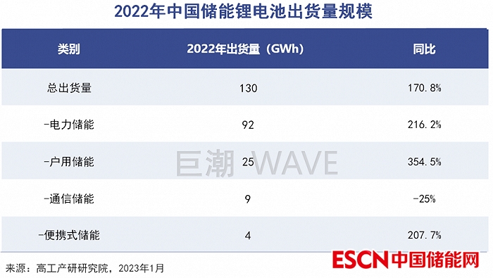 根據(jù)GGII最新調(diào)研數(shù)據(jù)統(tǒng)計(jì),2022年國內(nèi)儲能鋰電池出貨量達(dá)到130GWh,同比增速達(dá) 170%。這其中,電力儲能電池出貨量為92GWh;戶用儲能電池出貨量為25GWh;通信儲能電池出貨量為9GWh;便攜式儲能電池出貨量為4GWh。