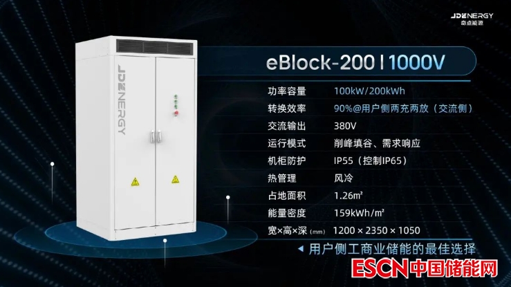 針對工商業(yè)儲能和光儲充融合需要,奇點能源研發(fā)的1000V能量塊產品eBlock200,秉承了極致安全的集成設計理念,實現了單機柜完整的浸沒式消防功能。eBlock200額定容量100kW/200kWh,在每日兩充兩放的運行工況下,交流側系統(tǒng)轉換效率大于90%,交流輸出380V可直接并入工商業(yè)園區(qū)的配電網絡。