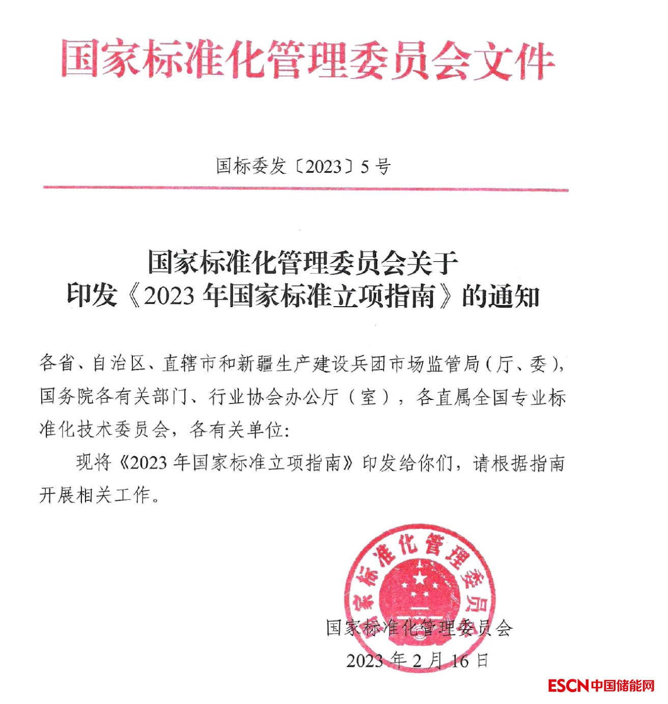 中國儲(chǔ)能網(wǎng)訊:近日,國家標(biāo)準(zhǔn)化管理委員會(huì)印發(fā)《2023年國家標(biāo)準(zhǔn)立項(xiàng)指南》(簡稱《指南》)。《指南》明確立項(xiàng)重點(diǎn),強(qiáng)制性國家標(biāo)準(zhǔn)重點(diǎn)支持鋰電池安全、儲(chǔ)能電站安全等領(lǐng)域。推薦性國家標(biāo)準(zhǔn)2023年重點(diǎn)支持碳達(dá)峰碳中和、關(guān)鍵基礎(chǔ)材料、新興技術(shù)等14個(gè)領(lǐng)域,其中包括儲(chǔ)能裝備等重點(diǎn)高端裝備標(biāo)準(zhǔn)以及新型電力系統(tǒng)、新型儲(chǔ)能等關(guān)鍵技術(shù)標(biāo)準(zhǔn)。