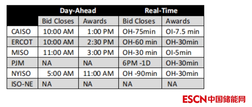對于實時市場,“-1D”表示前一天,“OH”表示運行時間,“OI”表示運行時段長度(CAISO為15分鐘,MISO為5分鐘)。ISO-NE利用其在能源市場上遠期備用市場的出清結(jié)果來分配旋轉(zhuǎn)儲備,因此沒有一個單獨的市場。由于大多數(shù)輔助服務都是在日前市場中交易的,需求側(cè)資源將希望參與這些市場。