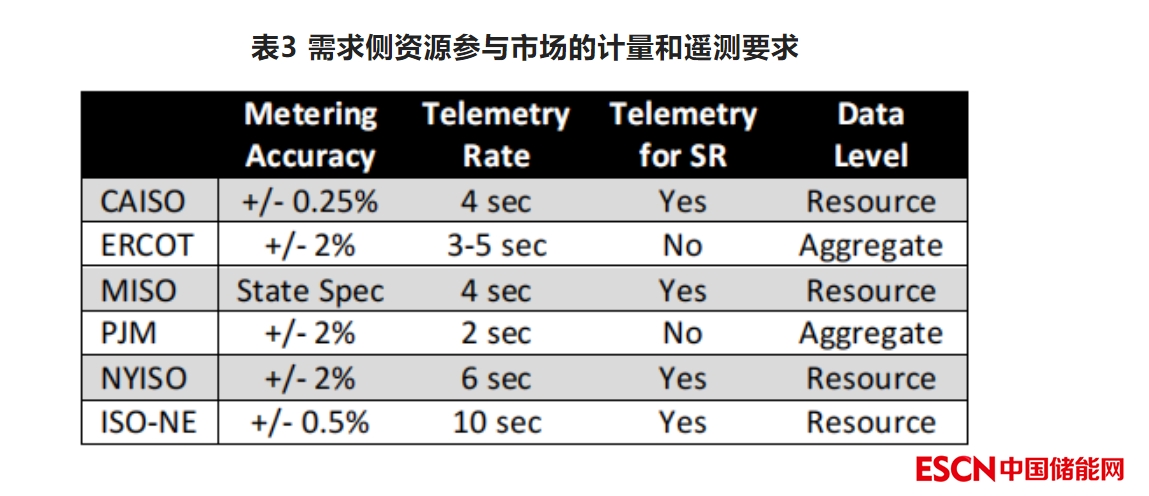 由于需求側(cè)資源比傳統(tǒng)的發(fā)電機要小得多,使同規(guī)模的需求側(cè)資源在參與輔助服務市場時達到與傳統(tǒng)資源一樣的計量和遙測標準,可能會花費更多成本。表3顯示各個市場中的有關(guān)要求。