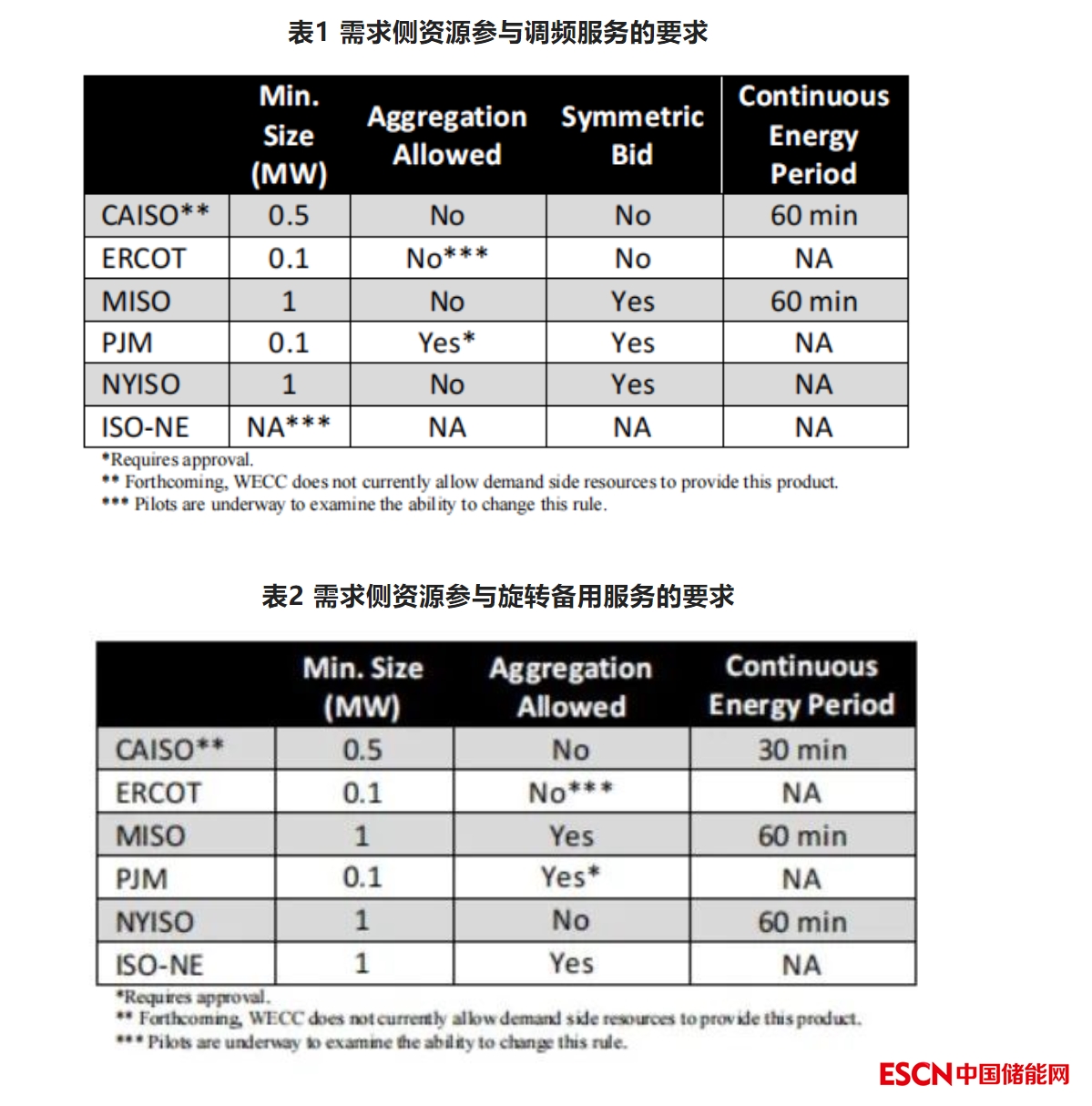 需求響應及其他需求側(cè)資源比傳統(tǒng)發(fā)電機單體容量小,并且所提供的服務可能持續(xù)性不足。表1和表2描述了各大ISO對需求響應資源提供調(diào)頻和旋轉(zhuǎn)備用的要求,具體包括最小規(guī)模、是否允許獨立計量的需求側(cè)資源聚合參與市場(Aggregation Allowed),以及調(diào)節(jié)持續(xù)時間等三個方面。此外,除了CAISO和ERCOT以外的ISO/RTO,均要求調(diào)頻資源提供上下對稱的調(diào)節(jié)能力。