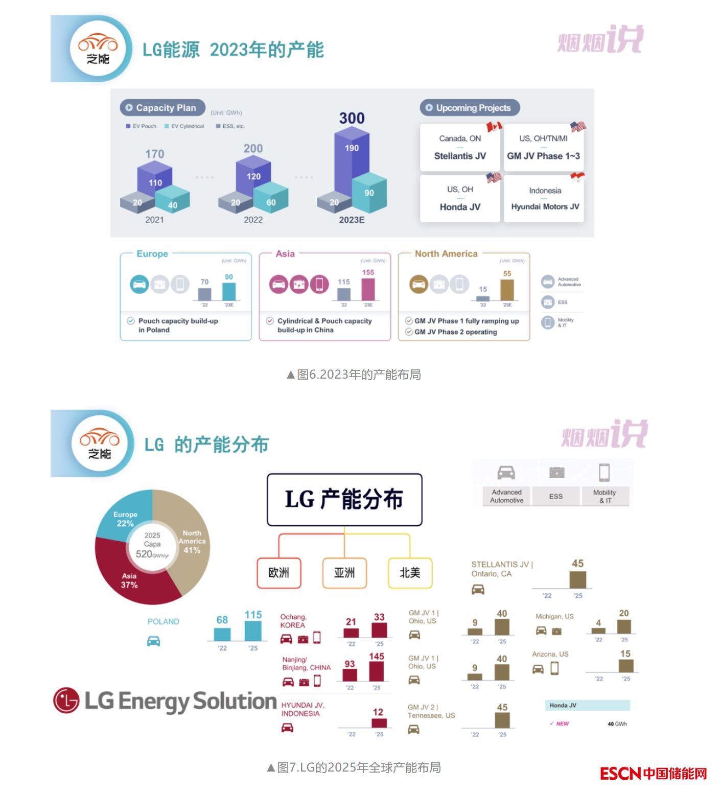 LG在2022年底全球電池及儲能產(chǎn)能共計200GWh,從三個區(qū)域和不同應(yīng)用方向去擴(kuò)充產(chǎn)能,2020年300GWh,2025年能實現(xiàn)520GWh的產(chǎn)能布局。