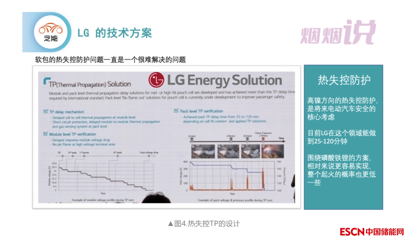 軟包的熱失控防護(hù)問題一直是一個很難解決的問題,高鎳方向的熱失控防護(hù),是將來電動汽車安全的核心考慮。目前LG在這個領(lǐng)域能做到25-120分鐘,圍繞磷酸鐵鋰的方案,相對來說更容易實現(xiàn),整個起火的概率也更低一些。