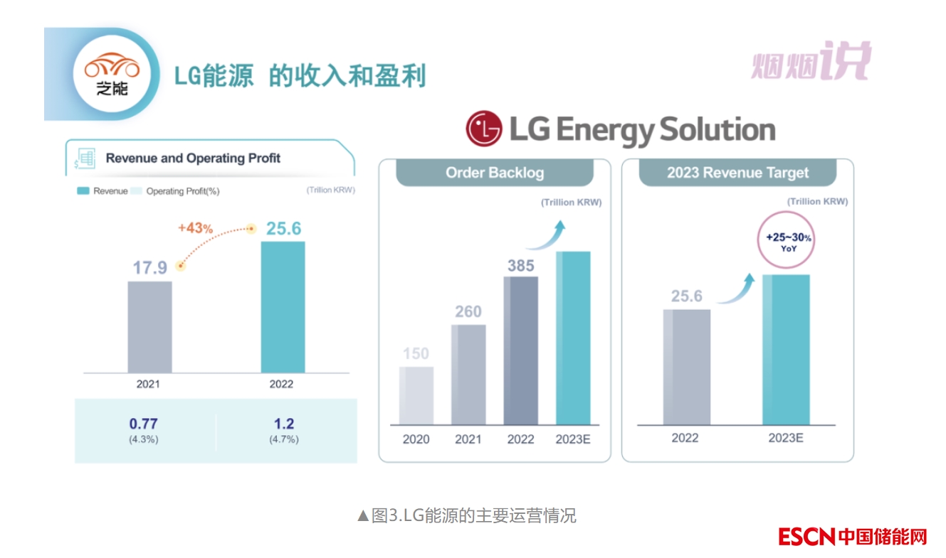 2022年全年營業(yè)收入25.6萬億韓元(人民幣1334.58億元),同比增長43%,是LGES的歷史最高銷售額,積極響應(yīng)電動汽車、儲能等市場需求,產(chǎn)品線的電池出貨量均實現(xiàn)增長。營業(yè)利潤同比增長58%,1.2萬億韓元(折合人民幣62.56億元),全年凈利潤為8,000億韓元(折合人民幣41.71億元),凈利潤率3%。