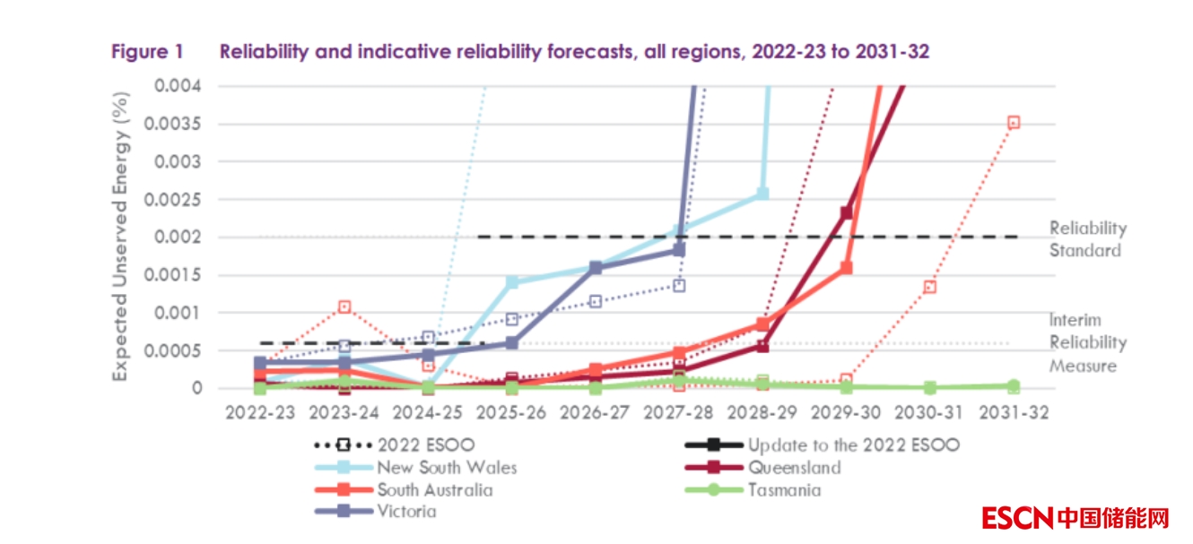 他提到,自發(fā)布2022年ESOO以來(lái),南澳大利亞州(2023-24年)和維多利亞州(2024-25年)的短期預(yù)測(cè)可靠性差距已經(jīng)被新的天然氣發(fā)電、風(fēng)電和電池儲(chǔ)能的發(fā)展所填補(bǔ),同時(shí)現(xiàn)有燃?xì)獍l(fā)電機(jī)的退役也被推遲。因此,在此次更新的可靠性預(yù)測(cè)中不需要新的零售商可靠性義務(wù)(RRO)可靠性工具。從2025年起,與臨時(shí)可靠性措施相比,可靠性差距開(kāi)始出現(xiàn)。預(yù)計(jì)從2027年起,各大陸地區(qū)的預(yù)期使用率將超過(guò)可靠性標(biāo)準(zhǔn),到2031-2032年時(shí),的所有大陸地區(qū)都將違反可靠性標(biāo)準(zhǔn),至少有5座燃煤電廠預(yù)計(jì)將退役,占NEM總?cè)萘康募s13%。因此,迫切需要對(duì)可再生能源、長(zhǎng)時(shí)儲(chǔ)能和傳輸進(jìn)行緊急和持續(xù)的投資,以可靠地滿足澳大利亞家庭和企業(yè)的需求。具體如下圖所示: