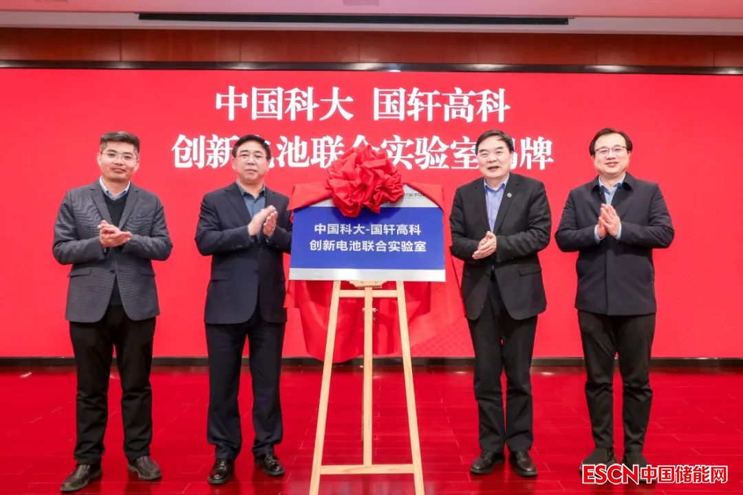 中國科大校長包信和(右二)、國軒高科董事長李縝(左二)為創(chuàng)新電池聯(lián)合實(shí)驗(yàn)室揭牌;中國科大黨委常委、副校長傅堯(右一),國軒高科工研總院常務(wù)副院長張宏立(左一)出席儀式