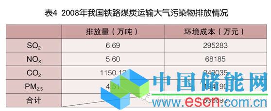 根據(jù)《中華人民共和國(guó)鐵道部2008年鐵道統(tǒng)計(jì)公報(bào)》,2008年全國(guó)鐵路貨物發(fā)送量完成329035萬(wàn)噸,煤炭運(yùn)量完成169146萬(wàn)噸,占51.41%。全國(guó)鐵路貨物周轉(zhuǎn)量為23360.32億噸公里,煤炭周轉(zhuǎn)量為8360.28億噸公里。根據(jù)鐵道部統(tǒng)計(jì)中心得出的鐵路運(yùn)輸大氣污染排放因子,可計(jì)算出2008年我國(guó)煤炭鐵路運(yùn)輸?shù)奈廴疚锱欧帕浚Y(jié)合前文計(jì)算出的大氣污染物環(huán)境成本,可得煤炭鐵路運(yùn)輸?shù)沫h(huán)境成本,如表4所示。2008年我國(guó)火力發(fā)電總量為278573680.4萬(wàn)千瓦時(shí),由此可計(jì)算煤炭鐵路運(yùn)輸?shù)沫h(huán)境成本Ce(鐵路運(yùn)輸)=0.0029元/千瓦時(shí)。