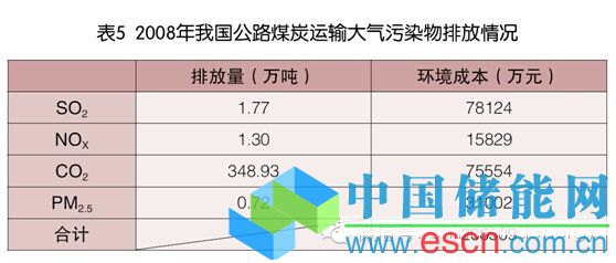根據(jù)《2009年公路水路交通行業(yè)發(fā)展統(tǒng)計(jì)公報(bào)》,2008年我國(guó)公路貨運(yùn)平均運(yùn)距為171.48公里,總周轉(zhuǎn)量為1664.35億噸公里,水路貨運(yùn)平均運(yùn)距為1706.66公里,總周轉(zhuǎn)量為6952.93億噸公里。結(jié)合公路與水路運(yùn)輸主要排放因子的數(shù)值,可計(jì)算出2008年我國(guó)煤炭公路運(yùn)輸?shù)奈廴疚锱欧帕浚汕拔挠?jì)算出的大氣污染物環(huán)境成本,可得煤炭公路運(yùn)輸?shù)沫h(huán)境成本,如表5所示。2008年我國(guó)火力發(fā)電總量為278573680.4萬(wàn)千瓦時(shí),由此可計(jì)算煤炭公路運(yùn)輸?shù)沫h(huán)境成本Ce(公路運(yùn)輸)=0.0007元/千瓦時(shí)。