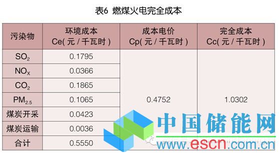 考慮燃煤火電對(duì)環(huán)境的污染及破壞帶來(lái)的經(jīng)濟(jì)損失后,燃煤火電完全成本Cc(燃煤)為燃煤火電成本電價(jià)Cp(燃煤)與燃煤火電環(huán)境成本Ce(燃煤)之和,見(jiàn)公式(4),具體數(shù)據(jù)如表6所示: