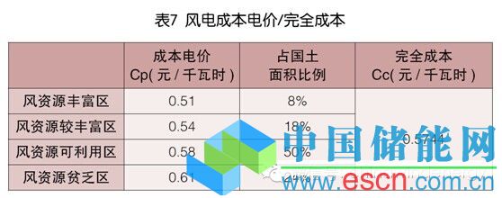 2009年7月,國(guó)家發(fā)改委價(jià)格司發(fā)布《關(guān)于完善風(fēng)力發(fā)電上網(wǎng)電價(jià)政策的通知》,按風(fēng)能資源狀況和工程建設(shè)條件,將全國(guó)分為四類(lèi)風(fēng)資源區(qū),成本電價(jià)如表7所示。由于風(fēng)力發(fā)電整個(gè)過(guò)程不會(huì)產(chǎn)生環(huán)境污染物,因此不計(jì)環(huán)境成本,即Ce(風(fēng)電)=0,風(fēng)電成本電價(jià)Cp(風(fēng)電)即可作為風(fēng)電完全成本Cc(風(fēng)電),如公式(5)所示: