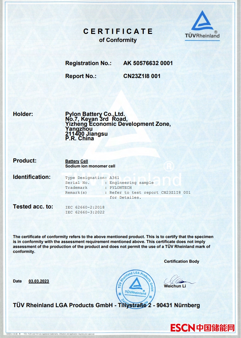 中國儲能網(wǎng)訊:3月3日,上海派能能源科技股份有限公司(以下簡稱派能科技)收到德國萊茵TüV集團(以下簡稱TüV萊茵)頒發(fā)的關(guān)于鈉離子電池認證證書,該證書為TüV萊茵頒發(fā)的全球首張鈉離子電池認證證書。