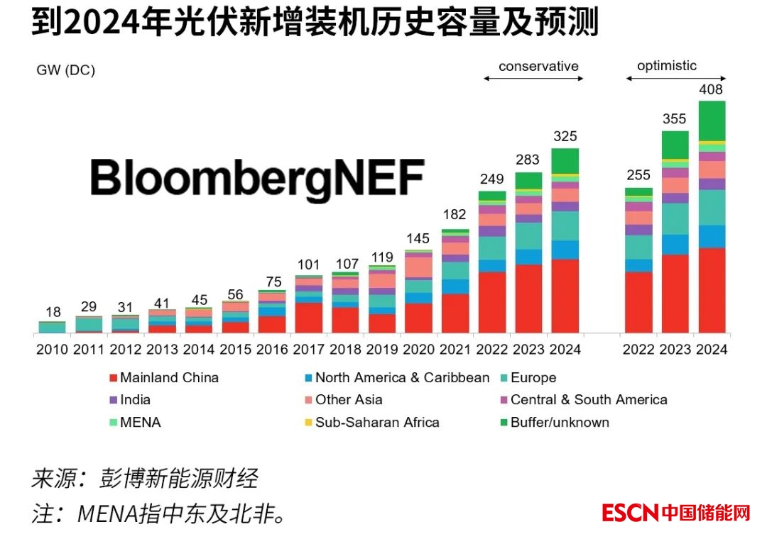 彭博新能源財(cái)經(jīng)對2023年新增光伏裝機(jī)容量的預(yù)期