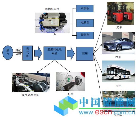 相關(guān)資料顯示,氫燃料電池主要包括電池組件和燃料兩個部分。因此其上游主要是氫氣供應以及電池零組件。中游則是將上述組裝,形成一個完整的可投入使用的燃料電池系統(tǒng)。下游的應用板塊主要包括了固定、交通運輸和便攜式三個主要領(lǐng)域。