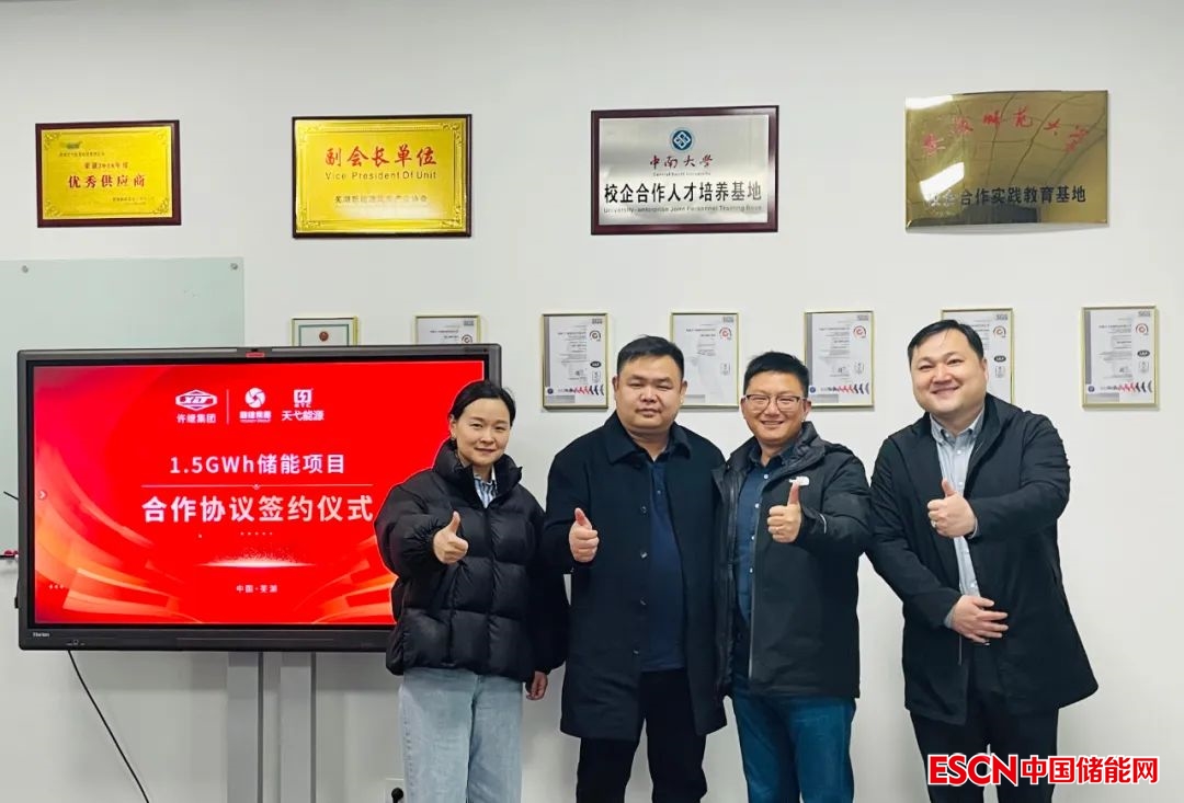 中國(guó)儲(chǔ)能網(wǎng)訊:2023年3月3日,融捷投資控股集團(tuán)有限公司旗下的蕪湖天弋能源科技有限公司(以下簡(jiǎn)稱“蕪湖天弋能源”)與許繼集團(tuán)綜合能源服務(wù)分公司(以下簡(jiǎn)稱“許繼集團(tuán)綜合能源”)簽署1.5GWh儲(chǔ)能項(xiàng)目合作協(xié)議。蕪湖天弋能源副總經(jīng)理吳總、銷售部總監(jiān)朱總,許繼集團(tuán)綜合能源公司首席專家張總,江蘇德春電力科技股份有限公司董事長(zhǎng)成董、董事長(zhǎng)助理薛董助等人出席簽約儀式。