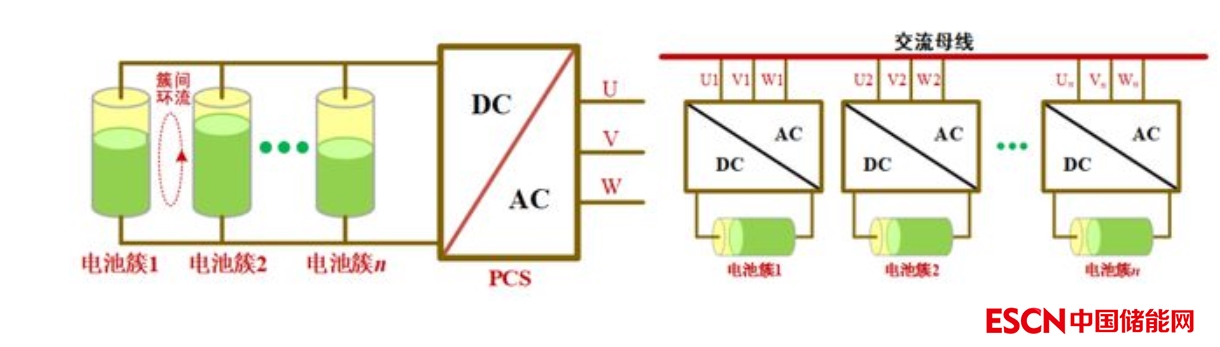 △集中式儲(chǔ)能架構(gòu)(左)、分散式儲(chǔ)能架構(gòu)(右)