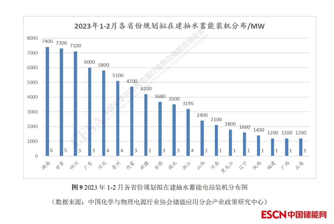 2023年1-2月共有49個(gè)抽水蓄能電站項(xiàng)目簽約、通過(guò)審核或有新進(jìn)展,總規(guī)劃規(guī)模達(dá)7.0875GW,由圖9可知,抽水蓄能電站規(guī)劃規(guī)模在5GW以上的省份有6個(gè),其中湖南省新規(guī)劃的抽水蓄能電站最多,有6個(gè),規(guī)模也最大,達(dá)7400MW;甘肅省5個(gè)規(guī)劃中的抽水蓄能電站規(guī)劃規(guī)模僅次于湖南省,達(dá)7300MW;四川省抽水蓄能規(guī)劃規(guī)模也突破了7000MW,三個(gè)抽水蓄能電站規(guī)劃規(guī)模高達(dá)7100MW;廣東省和河北省規(guī)劃規(guī)模在6000MW左右;貴州4個(gè)抽水蓄能電站規(guī)模達(dá)5100MW。