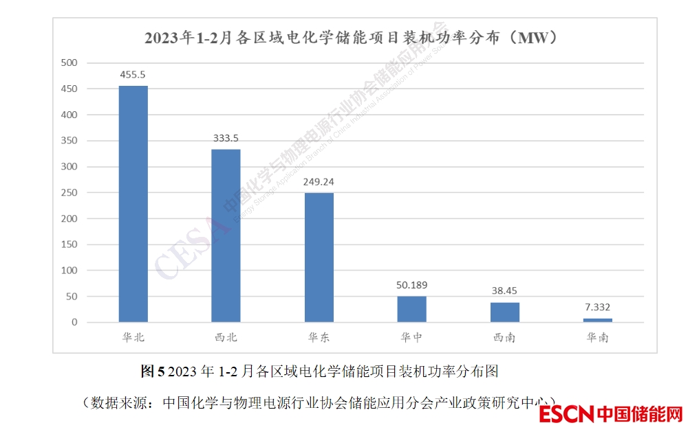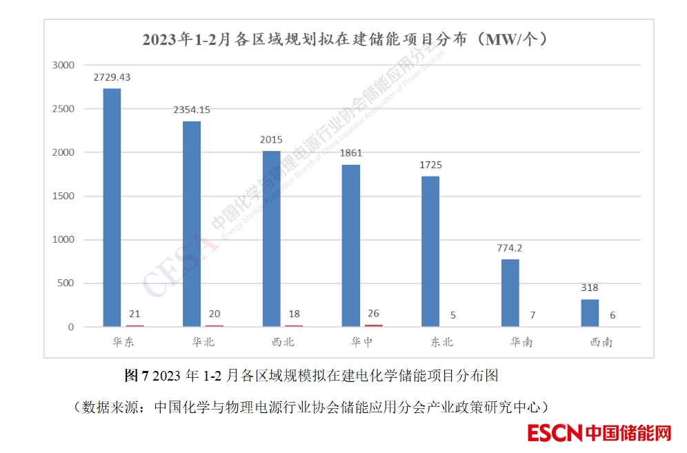 由圖7可以看出,2023年1-2月電化學(xué)儲(chǔ)能規(guī)劃擬在建項(xiàng)目主要集中在華東、華北、西北和華中區(qū)域,項(xiàng)目數(shù)量在20左右,華東、華北、西北區(qū)域規(guī)劃規(guī)模達(dá)到2GW,其中華東區(qū)域規(guī)劃規(guī)模達(dá)2729.43MW,華北區(qū)域達(dá)2354.15MW,西北區(qū)域?yàn)?015MW。
