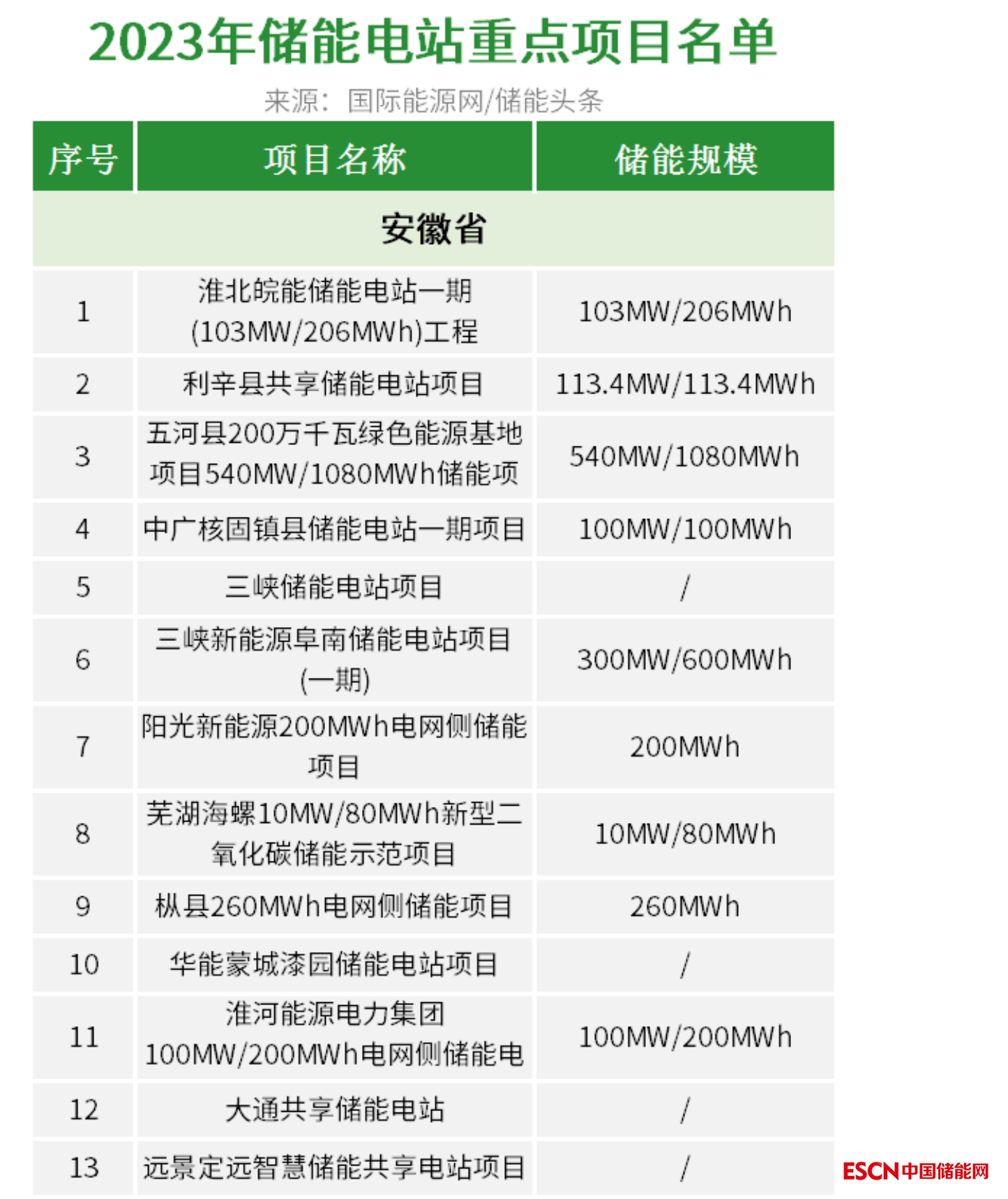 安徽省儲(chǔ)能建設(shè)項(xiàng)目13個(gè),其中包括淮北皖能儲(chǔ)能電站一期工程、中廣核固鎮(zhèn)縣儲(chǔ)能電站一期項(xiàng)目、三峽儲(chǔ)能電站項(xiàng)目等大型規(guī)模項(xiàng)目。