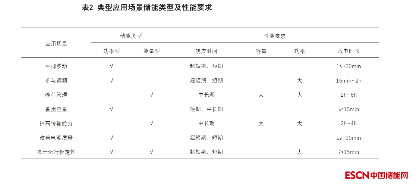 針對前述所提到的應用場景,可根據其應用功能將其歸納為以下七種典型應用場景,不同典型應用場景的儲能選型及性能要求見表2。