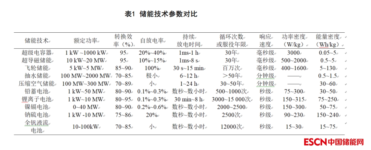 衡量一種儲能技術最基本的指標主要包含以下幾個部分:A.能量存儲容量;B.能量轉換效率;C.自放電率;D.持續(xù)放電時間;E.服役年限;F.響應速度;G.功率密度;H.能量密度。表1列舉了不同儲能技術的相關指標。