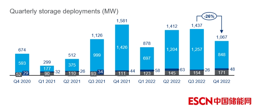 2022提第四季度部署的電池儲(chǔ)能系統(tǒng)裝機(jī)容量與2022年第三季度相比下降了26%,與2021年第四季度的1581MW相比減少了514MW。