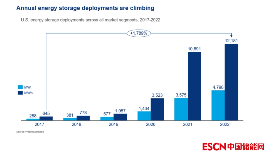 從更長(zhǎng)遠(yuǎn)的角度來(lái)看,在2017年,由于美國(guó)儲(chǔ)能行業(yè)剛剛起步,部署的電池儲(chǔ)能系統(tǒng)總規(guī)模為288MW/645MWh,這意味著與2017年相比,2022年美國(guó)儲(chǔ)能市場(chǎng)增長(zhǎng)了約1789%。