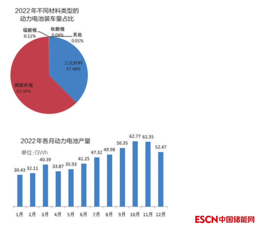 2022年不同材料類型動力電池產(chǎn)銷量及裝車量 單位:MWh