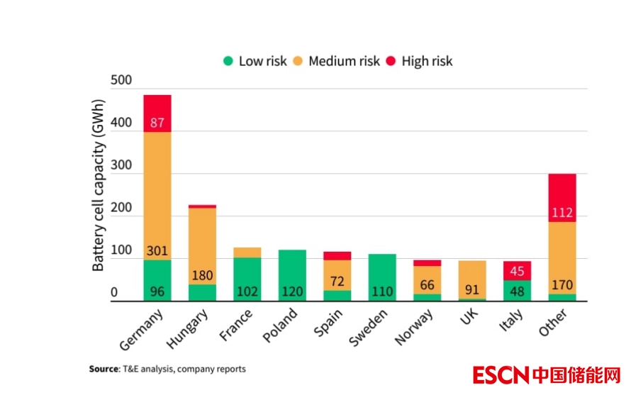 在計劃到2030年達到1.8TWh鋰離子電池產(chǎn)能中,該研究報告將16%產(chǎn)能(288GWh)定為“高風(fēng)險”,52%產(chǎn)能( (936GWh)定為中風(fēng)險,剩余32%產(chǎn)能( (576MWh)定為低風(fēng)險。下圖是歐盟各國計劃建設(shè)電池工廠的風(fēng)險分類。