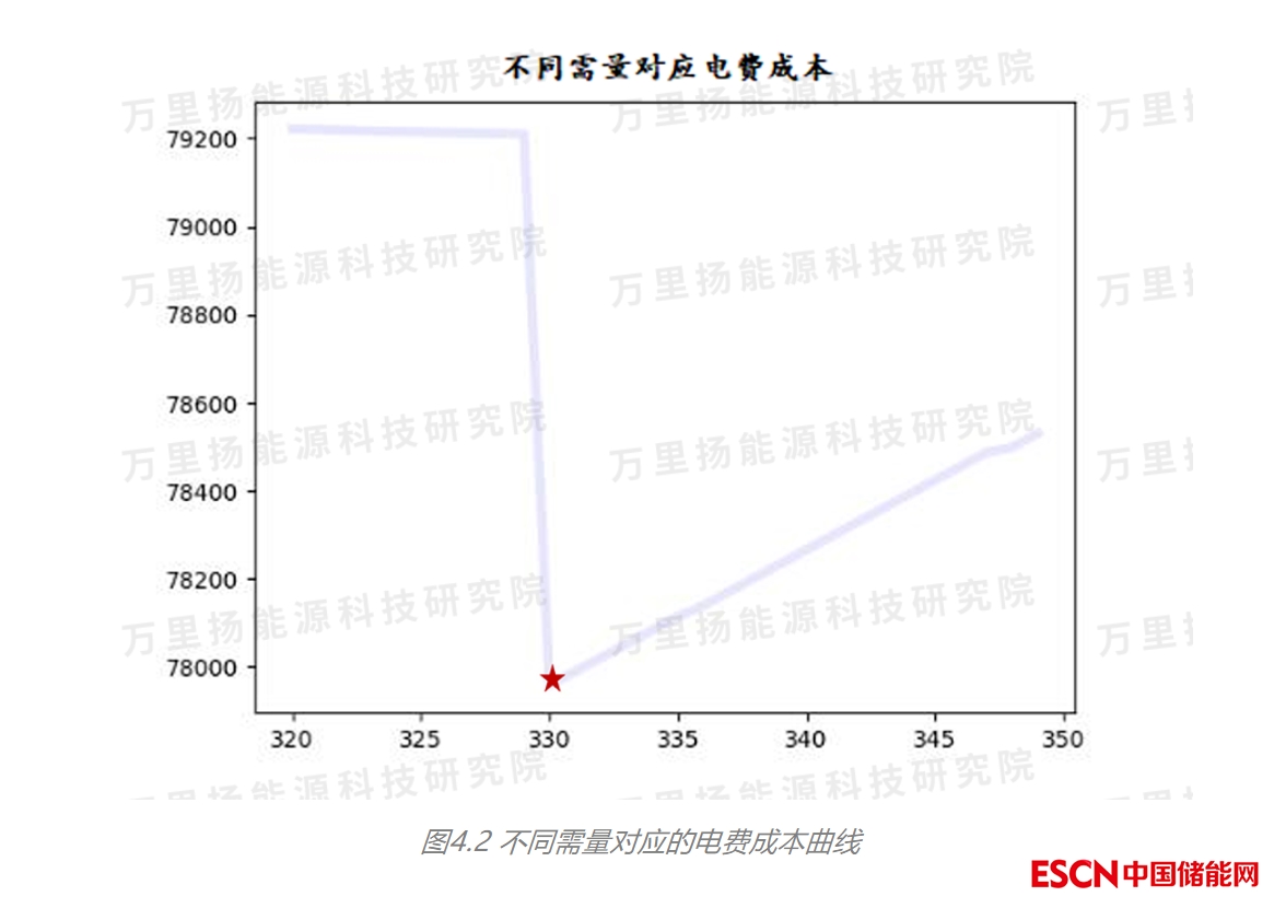 2. 當(dāng)儲能系統(tǒng)采用不考慮削峰填谷,只進(jìn)行需量電費(fèi)管理的運(yùn)行模式時,運(yùn)行得出需量值為319千瓦,該模式下調(diào)整成本為79377.96元。