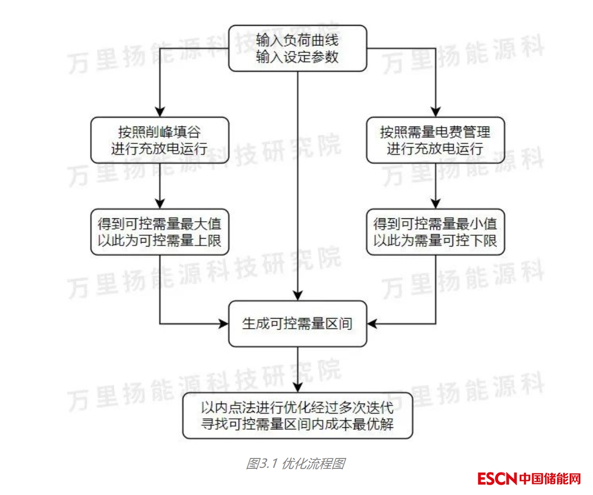 該問題是一個典型的具有多變量,多約束條件的優(yōu)化問題。該方案根據(jù)初始負(fù)荷矩陣,先計算出調(diào)整前電費(fèi)成本,便于進(jìn)行對比。再分別進(jìn)行削峰填谷、需量電費(fèi)管理兩種運(yùn)行模式,尋找可控需量值的區(qū)間后,在需量控制的基礎(chǔ)上不斷進(jìn)行削峰填谷充放電循環(huán),最終輸出儲能系統(tǒng)調(diào)整后的電費(fèi)成本。