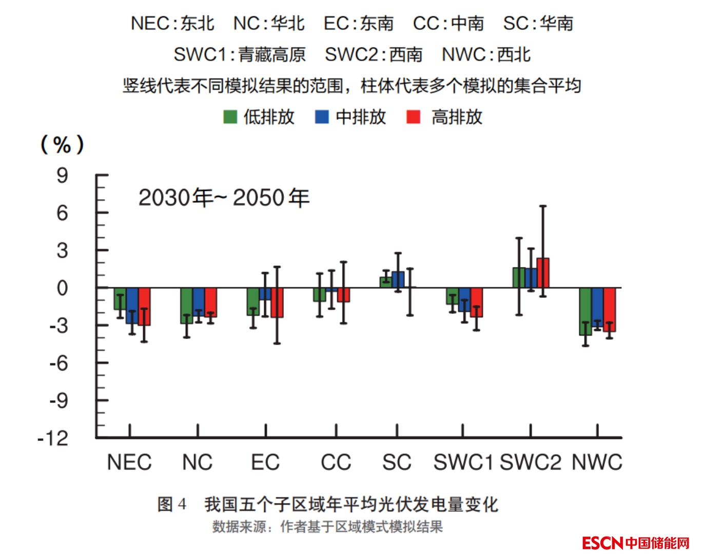 對(duì)未來(lái)我國(guó)太陽(yáng)能資源變化的區(qū)域性差異,進(jìn)一步進(jìn)行分析。2030 年~ 2050 年,除華南和西南地區(qū)外,我國(guó)大部分區(qū)域(包括東北、華北、中部、中南、青藏高原及西北)的年平均光伏發(fā)電量均表現(xiàn)為減少,但變化幅度均不超過(guò) 3%。西北地區(qū)太陽(yáng)能資源豐富區(qū)減幅最大,三種不同排放情景下的減少值分別為 3.8%、 3.1% 和 3.5%。華南和西南地區(qū)則表現(xiàn)為增加,但幅度較小,不到 3%,另外,西南地區(qū)模擬的不確定性較大(見(jiàn)圖 4)。
