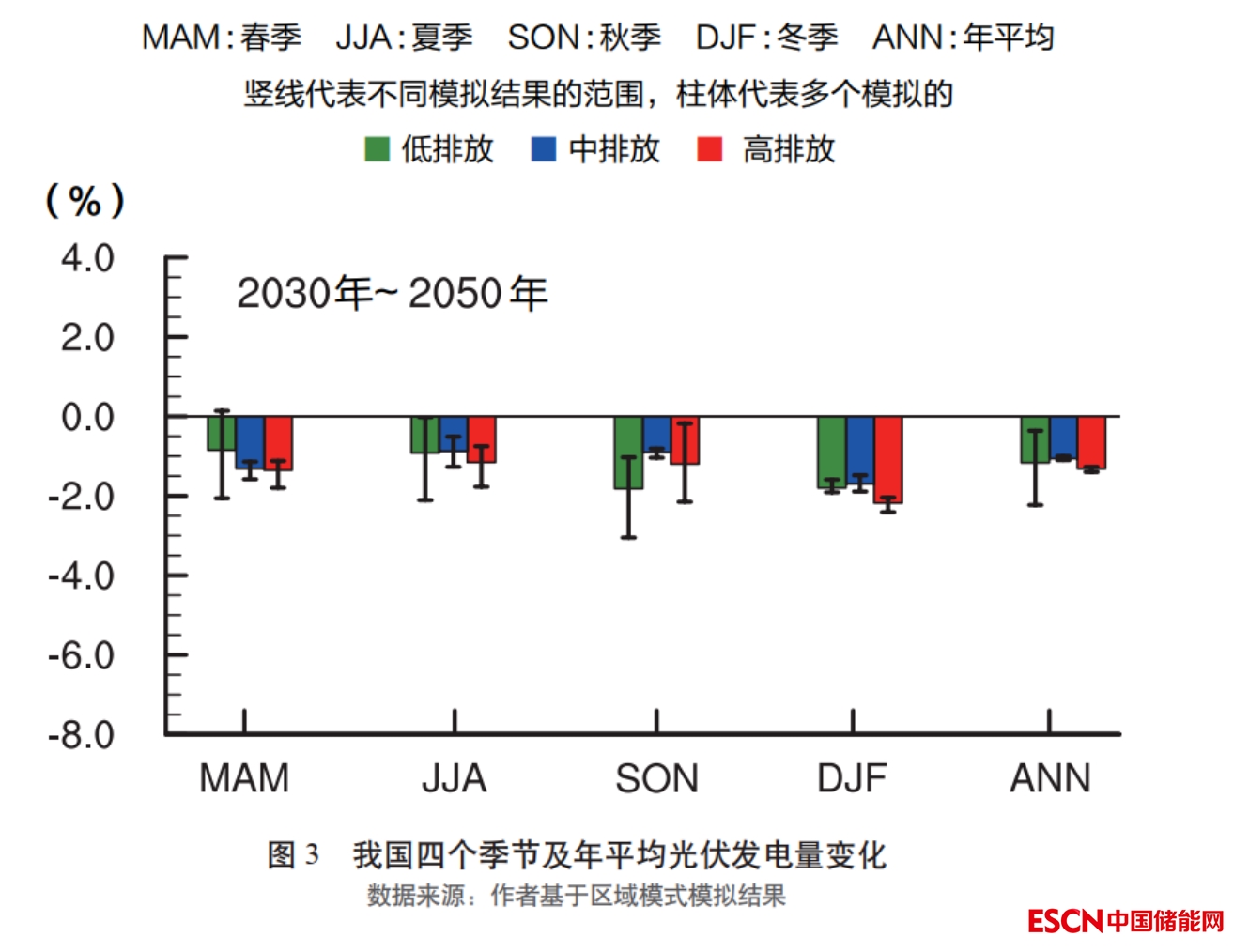 本文基于以上多組模擬結(jié)果,分析了不同排放情景下我國(guó) 2030 年~ 2050 年太陽(yáng)能資源變化的季節(jié)性和區(qū)域性差異。光伏發(fā)電量的計(jì)算,考慮了太陽(yáng)輻射、氣溫和地表風(fēng)速的綜合影響。首先,對(duì)我國(guó)四個(gè)季節(jié)及年平均的光伏發(fā)電量變化百分率進(jìn)行分析??梢钥吹?, 2030 年~ 2050 年我國(guó)四個(gè)季節(jié)平均的光伏發(fā)電量均表現(xiàn)為減少,但總體的變化幅度不大,其中冬季的減幅略大,三種排放情景下的減少值分別為 1.8%、 1.7% 和2.2%。我國(guó)年平均光伏發(fā)電量在不同排放情景下均為減少,不同排放情景之間的差異不明顯,減少值范圍在 1.1% 至 1.3% 之間( 見(jiàn)圖 3)。