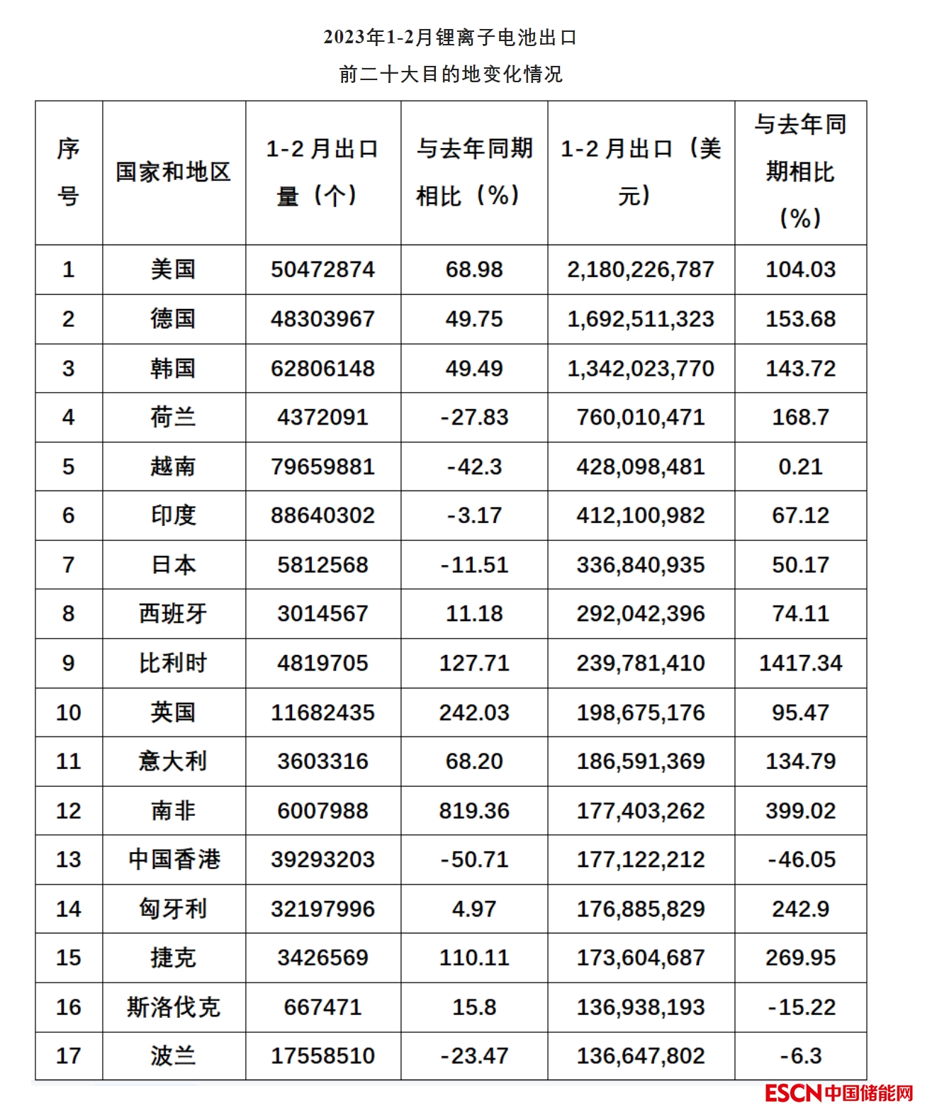 其中,2023年1月鋰離子電池出口額為56.48億美元,2022年1月為33.25億美元,同比增長66.8%;2023年1月鋰離子電池出口數(shù)量為3.02億只,2022年1月為3.89億個(gè),同比減少22.4%。2023年2月鋰離子電池出口額46.11億美元,2022年2月為22.71億美元,同比增長103%;2023年2月鋰離子電池出口數(shù)量為2.38億個(gè),2022年2月為2.27億個(gè),同比增長4.8%。