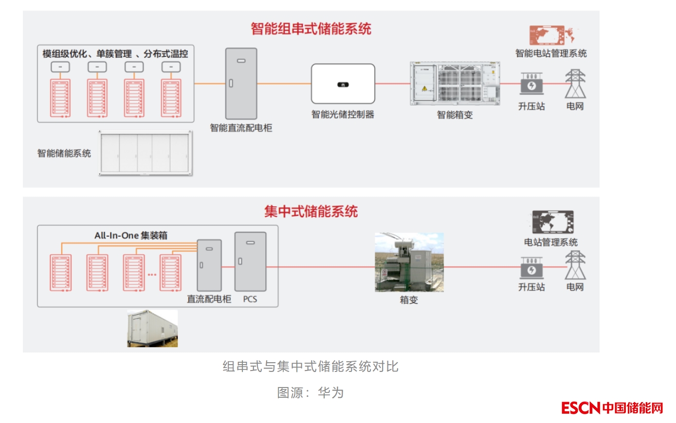 目前業(yè)內(nèi)電池儲(chǔ)能系統(tǒng)主要采取集中式PCS,多組電池并聯(lián)將引起電池簇之間的不均衡;組串式PCS可以實(shí)現(xiàn)簇級(jí)管理,提升系統(tǒng)壽命,提高全壽命周期放電容量,組串式PCS規(guī)模化應(yīng)用趨勢(shì)已見雛形。比如華能黃臺(tái)100MW/200MWh項(xiàng)目,是國(guó)內(nèi)首個(gè)采用組串式PCS架構(gòu)的大型儲(chǔ)能電站(PCS由上能電氣提供);山東德州林洋光儲(chǔ)3MW/6MWh項(xiàng)目也采用該系統(tǒng)架構(gòu)(華為提供整套系統(tǒng))。