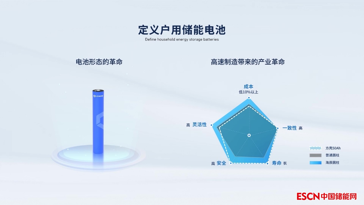 海辰大圓柱戶用儲能專用電池與傳統(tǒng)小方殼以及小圓柱電池相比,在成本、配組靈活性、安全性、壽命以及一致性上實現(xiàn)了大幅提升。例如在成本方面,大圓柱電池在生產(chǎn)方面依托高速產(chǎn)線輸出,成本優(yōu)勢明顯,其相較傳統(tǒng)生產(chǎn)低10%以上;又如在循環(huán)壽命方面較傳統(tǒng)圓柱電池大幅提升,突破5000次大關(guān);同時,其靈活適配性更強,可滿足戶用儲能應(yīng)用場景定制化需求。
