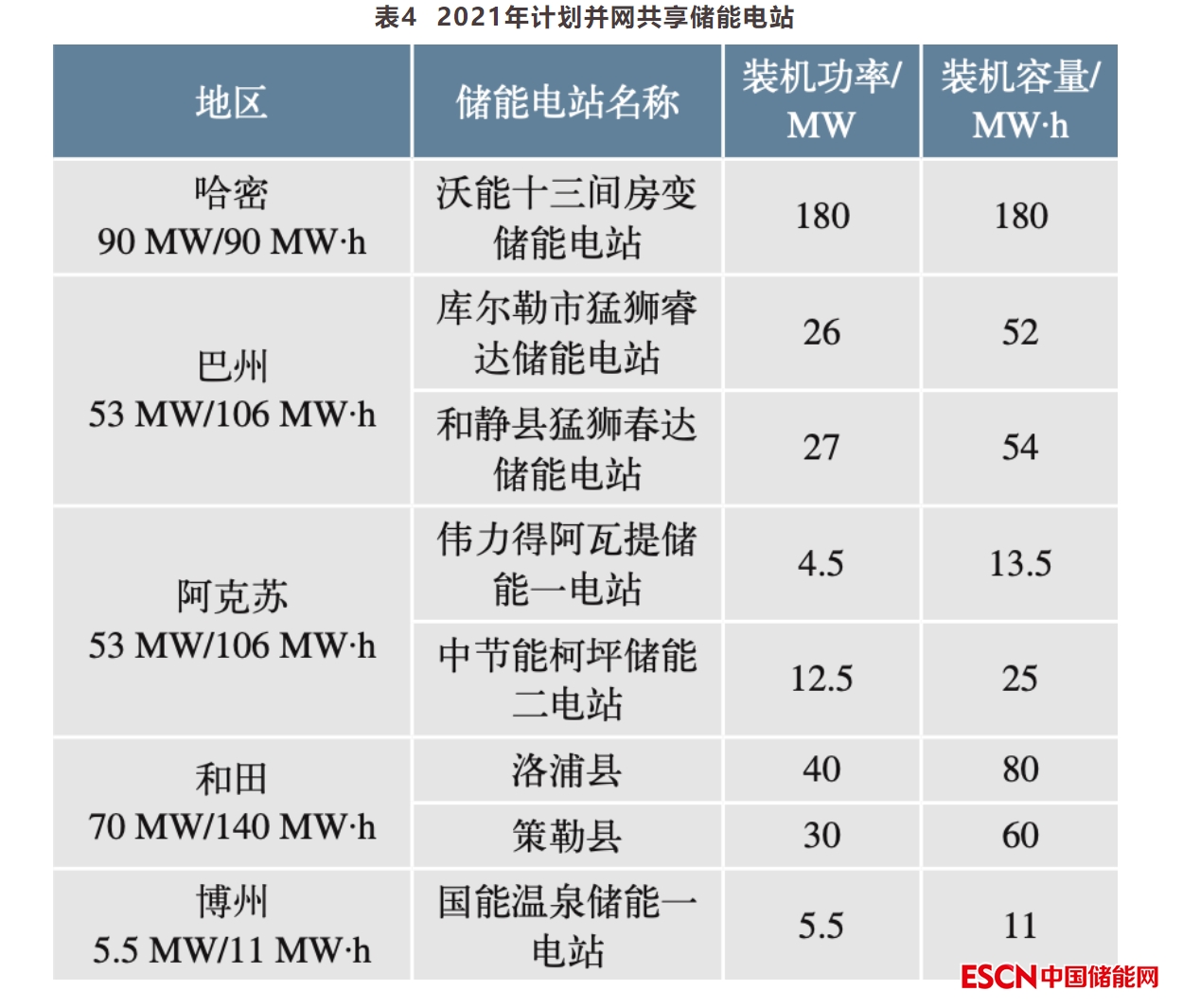 新疆推進(jìn)的儲(chǔ)能模式為電源側(cè)的“新能源+儲(chǔ) 能”運(yùn)營(yíng)模式和“單體+共享”儲(chǔ)能模式,目前在新疆電網(wǎng)已接入發(fā)電側(cè)儲(chǔ)能電站6座,全部在南疆地區(qū),共計(jì)6萬(wàn)kW/12.3萬(wàn)kW·h,均為光伏電站內(nèi)集中布置。2021年計(jì)劃在博州、哈密、烏魯木齊、和田、阿克蘇和巴州地區(qū)投運(yùn)9座儲(chǔ)能電站,見(jiàn)表4。