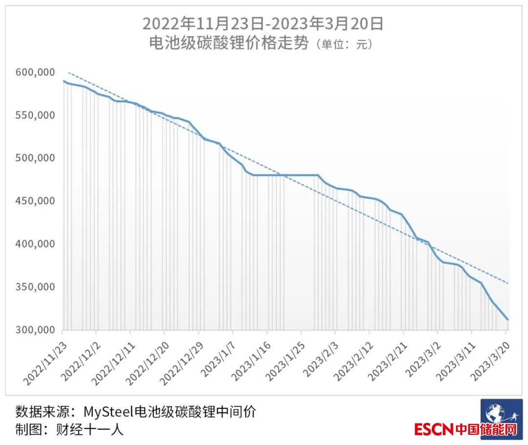 但是從2023年1月特斯拉打響價(jià)格戰(zhàn)第一槍之后,三個(gè)月以來(lái),車企都在價(jià)格戰(zhàn)中疲于應(yīng)付,大多數(shù)目前尚在虧損的新能源車企應(yīng)對(duì)價(jià)格戰(zhàn)的彈藥嚴(yán)重不足,而此時(shí)碳酸鋰價(jià)格的快速下行成為了他們?cè)趦r(jià)格戰(zhàn)中堅(jiān)持下去的重要支撐。根據(jù)測(cè)算,碳酸鋰價(jià)格每噸下跌10萬(wàn)元,10KWh電池的成本降低700元左右,裝車電池60KWh的車型單車成本相比去年底已經(jīng)降低上萬(wàn)元。