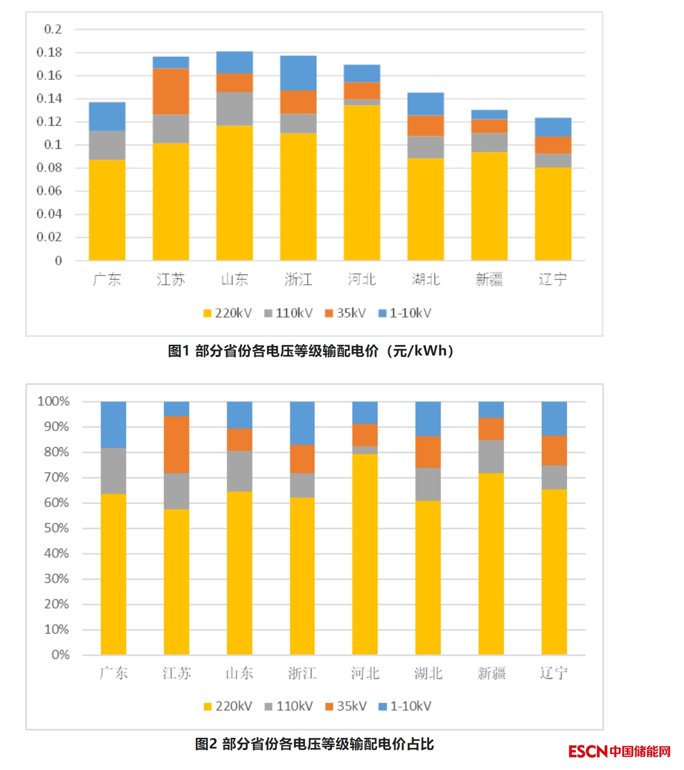 現(xiàn)今發(fā)布的輸配電價中,配電業(yè)務(wù)(110kV及以下)對應(yīng)部分電價較低,也導(dǎo)致增量配電盈利難的問題。我國尚沒有實現(xiàn)輸電業(yè)務(wù)和配電業(yè)務(wù)分離,輸電價格與配電價格的核算難以做到透明,尤其以省級電網(wǎng)為單位進(jìn)行核定時,企業(yè)的人力成本、管理費用、其他費用等如何在不同電壓等級進(jìn)行分?jǐn)傆绊懜麟妷旱燃夒妰r的合理性,當(dāng)前電壓等級的差價并不足以反映配電業(yè)務(wù)的實際成本。圖1、圖2顯示了部分省份輸配電價構(gòu)成(兩部制),配電網(wǎng)部分的占比僅在30%-40%。增量配電企業(yè)由于其規(guī)模效應(yīng)更小,管理費用分?jǐn)倝毫Ω?,相較省級電網(wǎng)公司能在全省層面均衡成本,增量配電企業(yè)通過配電網(wǎng)較低的輸配電價實現(xiàn)盈利難度更大。