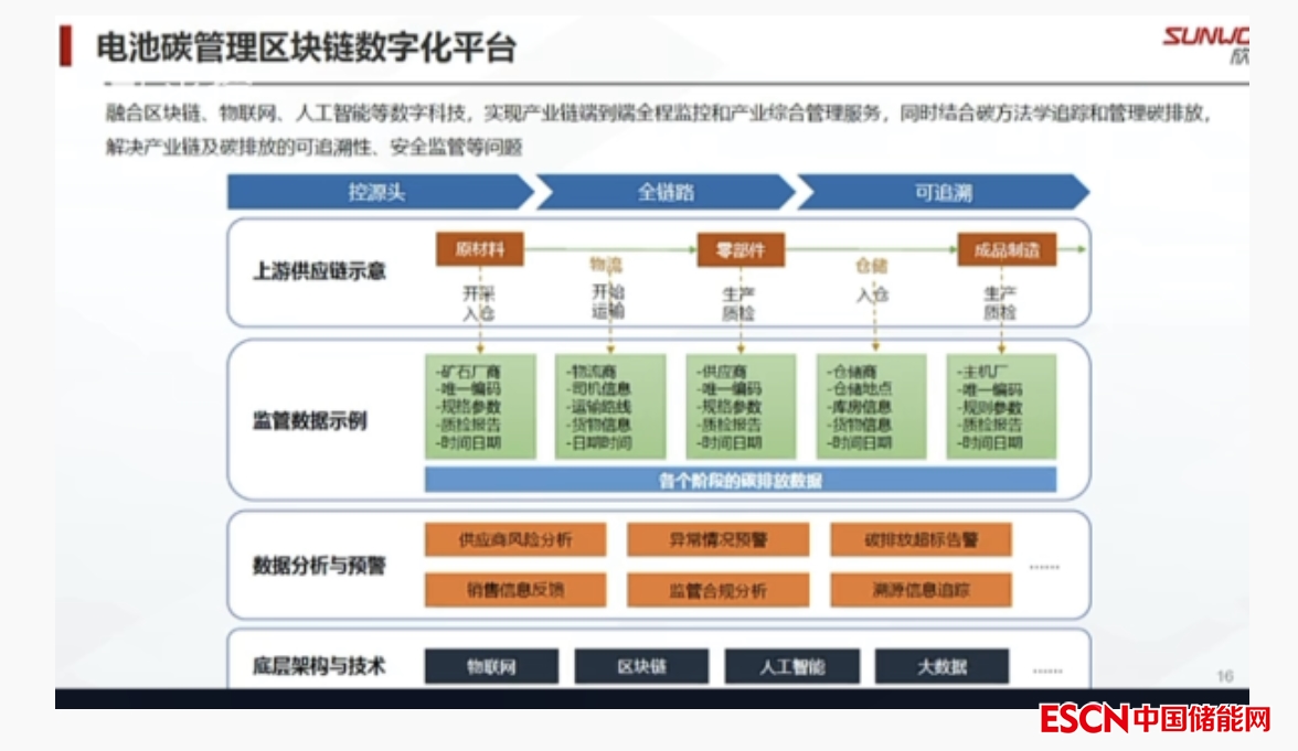 再次,在此基礎上,需要建立電池碳管理區(qū)塊鏈數(shù)字化平臺,要融合物聯(lián)網(wǎng)、人工智能等數(shù)字科技,實現(xiàn)產(chǎn)業(yè)鏈端到端全程監(jiān)控和產(chǎn)業(yè)綜合管理服務,同時結(jié)合碳方法學追蹤和管理碳排放,解決產(chǎn)業(yè)鏈及碳排放的可追溯性的問題。