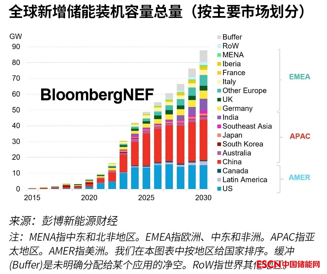 到2030年底的全球累計(jì)儲(chǔ)能裝機(jī)容量預(yù)測(cè)